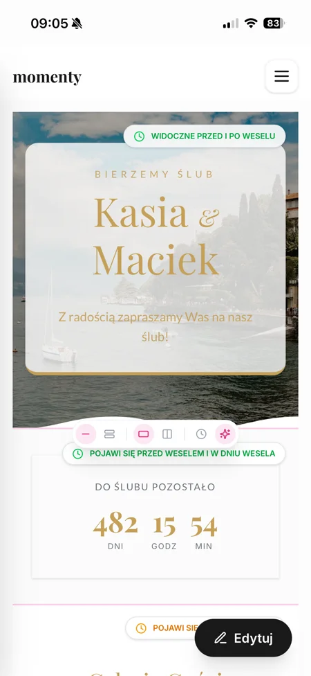 Kreator strony ślubnej bez kodowania - zaproście Gości, zbierajcie RSVP i udostępniajcie informacje online.