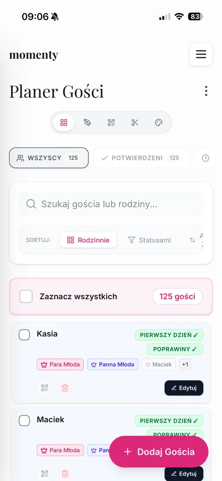 Zobacz funkcjęZarządzaj listą gości: od grup i diet, po bileciki QR i winietki w jednym systemie.